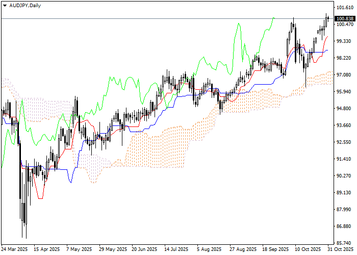 Pada grafik harian garis Tenkan-sen di atas Kijun-sen, garis merah mengarah ke atas, sedangkan yang biru tetap horisontal. Garis Konfirmatif Chikou Span berada di atas grafik harga, awan saat ini sedang naik. Instrumen ini diperdagangkan di atas garis Tenkan-sen dan Kijun-sen; tren Bullish masih kuat. Level support terdekat adalah garis Tenkan-sen (100.234). Salah satu level maksimum sebelumnya yaitu garis Chikou Span diharapkan akan menjadi level resistance (102.668).